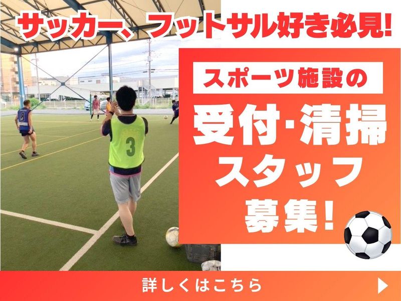 職種/仕事内容 | 仕事内容 ⸜⸜ 大学生・主婦さん中心に活躍中! ⸝⸝ 土日祝のみ勤務のスタッフ大募集♪ ✅週1日・2日程度~、1日4時間~勤務OK! ✅20代、30代の若手を中心に活躍中☆彡 ✅日中だけ/夕方からなど働き方は自由◎ ✅未経験・久しぶりのお仕事復帰も歓迎! ✅16:00~25:00の締めは重宝します! . ݁. ݁₊ ⊹ . ݁˖ . ݁. ݁₊ ⊹ . ݁˖ . ݁. ݁₊ ⊹ . ݁˖ . ݁. ݁₊ ⊹ . ݁˖ . ݁. ✨スポーツ施設のお仕事をお任せ✨ ☄フロント・受付 予約受付や電話対応など! 簡単なPC入力ができればOK! ☄清掃 店舗内外の清掃業務 キレイ好きな方は大歓迎♪ ☄サッカー・フットサル関連業務 当日集まったお客様で試合を行う、 「個人参加フットサル」の 接客・タイムキープをお任せします! 経験者の方は、スクールアシスタント、 大会審判などにて活躍の場増加! ⏩審判時は時給200円アップ! 経験者でなくとも充実の研修で安心! 【従業員構成】 ⭐10代~20代:5名 └ 女性スタッフも在籍しており、 スポーツを楽しみながら活躍しています! ⭐30代~50代:3名 └ フットサル・サッカーなどの スポーツ経験を活かし、 年齢問わず幅広い世代が活躍中! . ݁. ݁₊ ⊹ . ݁˖ . ݁. ݁₊ ⊹ . ݁˖ . ݁. ݁₊ ⊹ . ݁˖ . ݁. ݁₊ ⊹ . ݁˖ . ݁. ✨大好きなスポーツを仕事にしよう✨ ⏩仕事を通して、お客様と交流や 自身のスポーツの経験を活かせる! お客様と一緒にフットサルを 行う機会もあります! ⏩初心者・バイトデビュー歓迎! 安心してスタートしていただけるよう、 経験豊富な社員や先輩スタッフが バックアップ♪やりがいを 感じてもらえる活気のある職場です! フットサル・スポーツに 関わったことがなくともOK! その他強みや目標に応じて、 任せられる業務があります! ⏩同年代のスタッフが多数活躍中! 「授業やサークルの合間に働きたい大学生」 「家事や育児と両立しながら、 週末だけ働きたい主婦(夫)さん」 「空いた時間を有効活用したい方」 ──そんな方にピッタリの環境です! . ݁. ݁₊ ⊹ . ݁˖ . ݁. ݁₊ ⊹ . ݁˖ . ݁. ݁₊ ⊹ . ݁˖ . ݁. ݁₊ ⊹ . ݁˖ . ݁. |