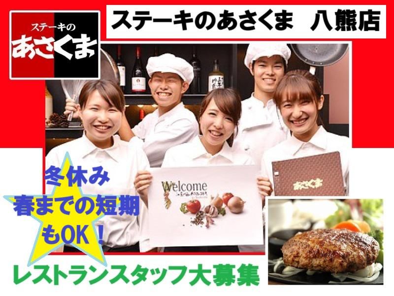 職種/仕事内容 | 仕事内容 ・。~~~~~~~~~~~~~~~~~ ✨ステーキのあさくま 八熊店✨ スタッフ大募集!長期勤務歓迎! 「冬休みだけ」「春まで」の短期もOK! アルバイトデビュー・パートデビュー応援♪ 飲食店・レストラン勤務経験者、大歓迎! もちろん未経験も歓迎です! ~~~~~~~~~~~~~~~~~・。 <ホール> お客様の案内やオーダーの受け付け、 料理の提供、席の片付け、 店内清掃などをお願いします。 <キッチン> 盛付・調理補助や惣菜作り、 ビュッフェの補充、洗い場、 清掃などをお願いします。 基本、裏方業務です。 *専任も両方やってみたいもOK! 飲食店・レストラン・カフェ勤務経験者、 大歓迎! もちろん未経験も歓迎です! |